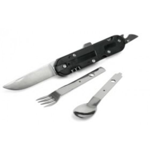 Campingset med gaffel, kniv, sked, kapsyl och vinöppnare. Levereras i nylonfodral.