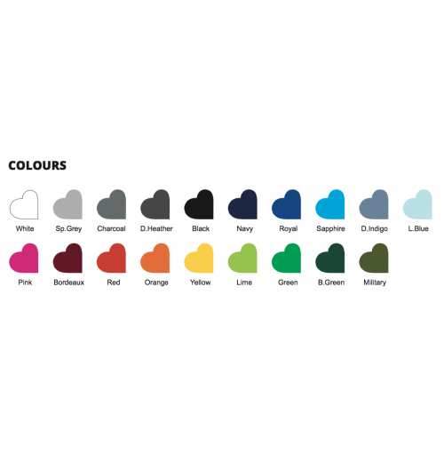Färg: Svart, Vit, Navy, Bordeaux, Sports Grey, Röd, Gul, Bottle Green, Charcoal, Dark Heather, Dusty Indigo, Green, Light Blue, Lime, Military, Orange, Pink, Royal, Sapphire