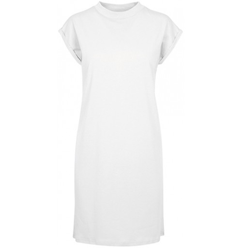 En kombination av t-shirt och klänning med lite överdrivna axlar och högre krage.