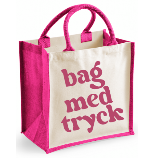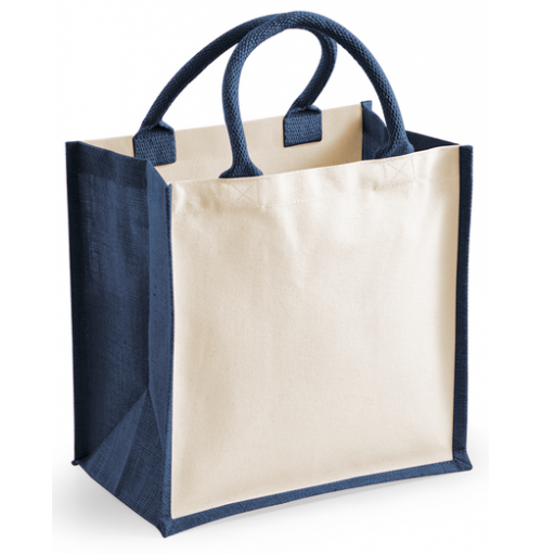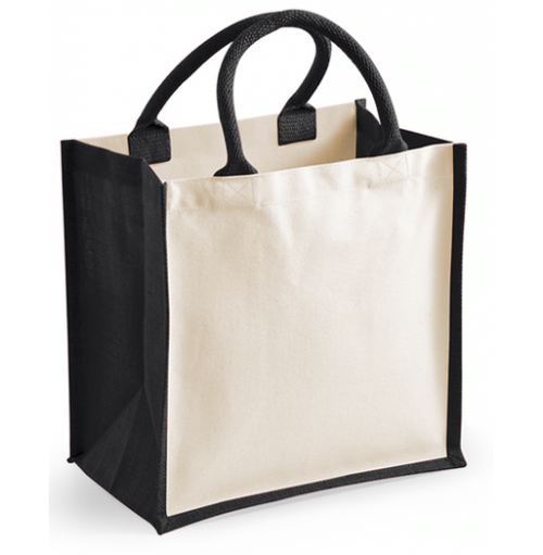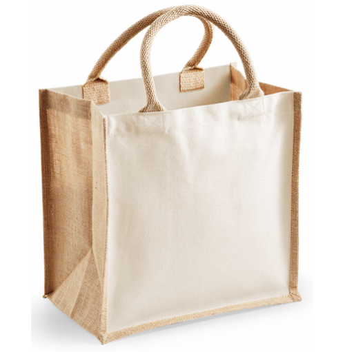 Handtag i bomull, fram och bakpaneler i laminerad jute.