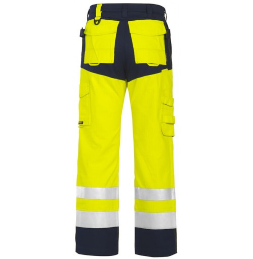 Flamskyddsbyxa med benfickor speciellt framtagna för verktyg och telefon. Två reglerbara hammarhankar. Tumstocksficka med verktygsficka och knivknapp. Två D-ringar. Bakfickor med övervidd. Förböjda knän med knäskyddsfickor som går att reglerbara i två höjder, öppning inifrån. EN ISO 11612 Klass A1, B1, C1, EN 1149-5, EN 13034 typ PB [6], EN 471 Klass 2 certifierad och IEC 61482 Klass 1. Q